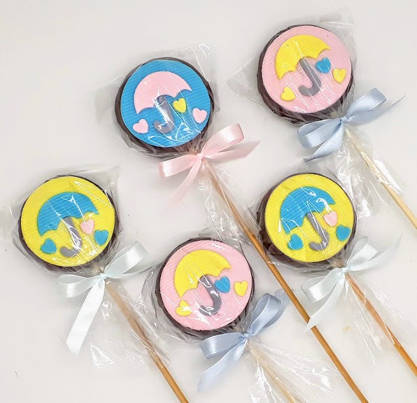 Acompanha saquinho de celofane e fita de cetim. Palito é opcional.