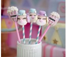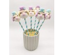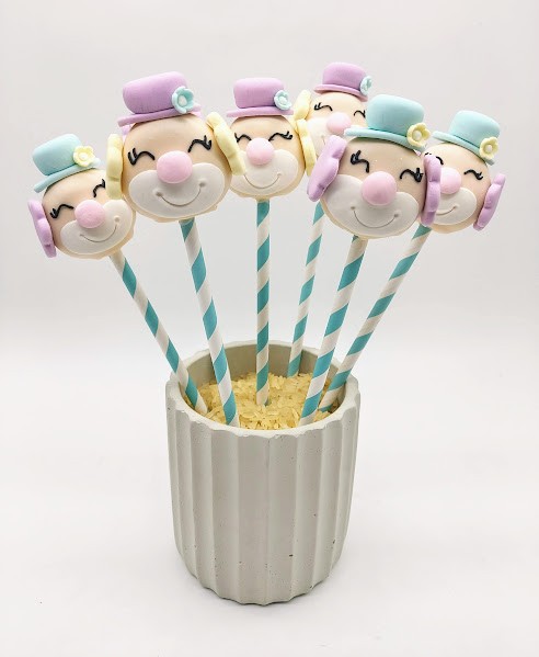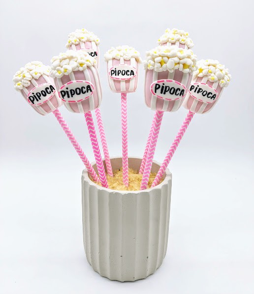 Bolo no palito (massa de baunilha/chocolate com doce de leite) coberto com chocolate e decoração em pasta americana.