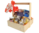 A cesta será embalada em celofane transparente com laço decorativo.