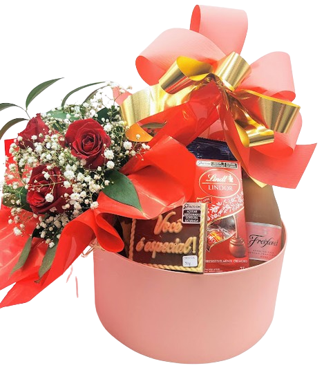 A cesta será embalada em celofane transparente com laço decorativo.