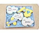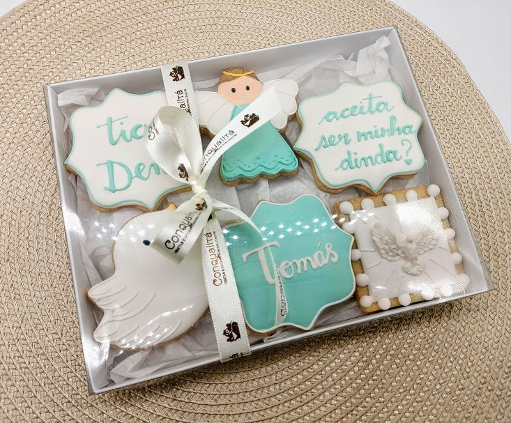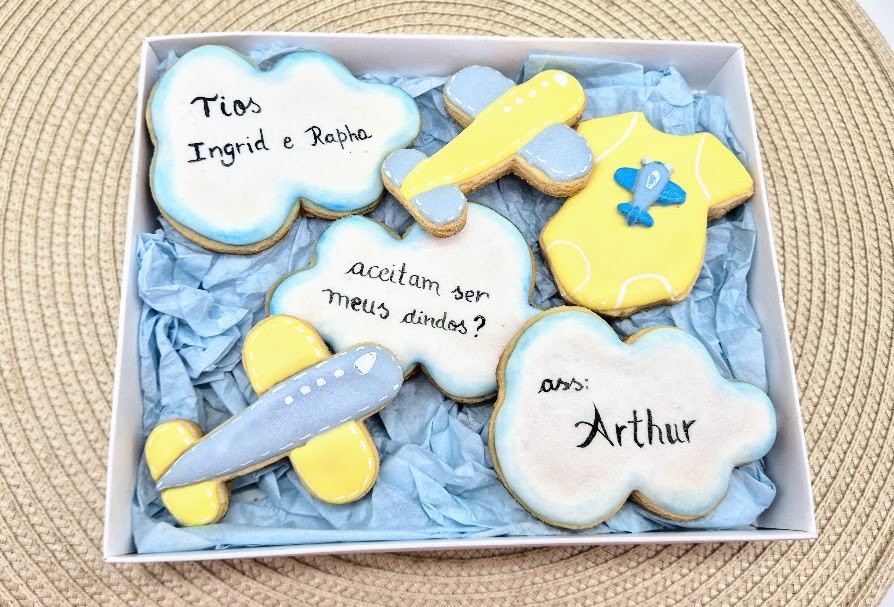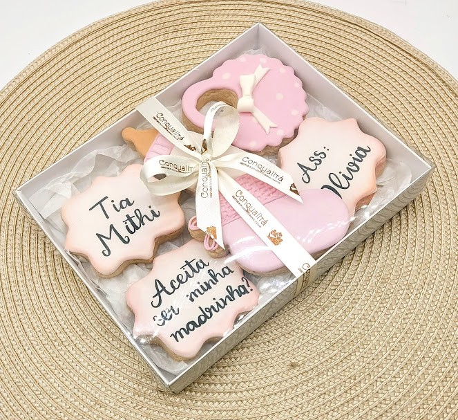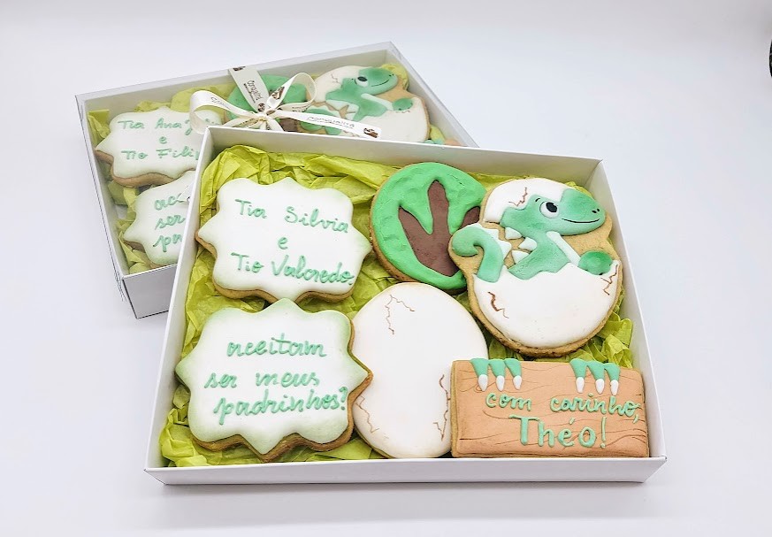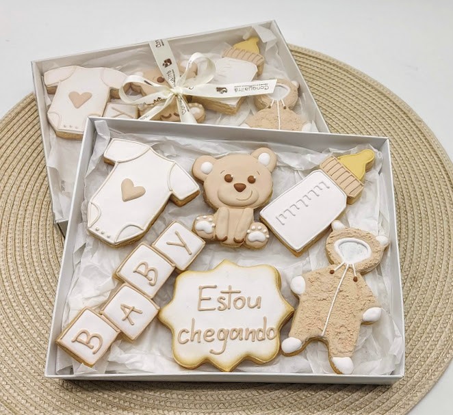 Caixa com lindos e gostosos biscoitos amanteigados decorados com glacê real.