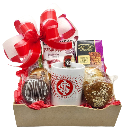 A cesta será embalada em celofane transparente com laço decorativo.