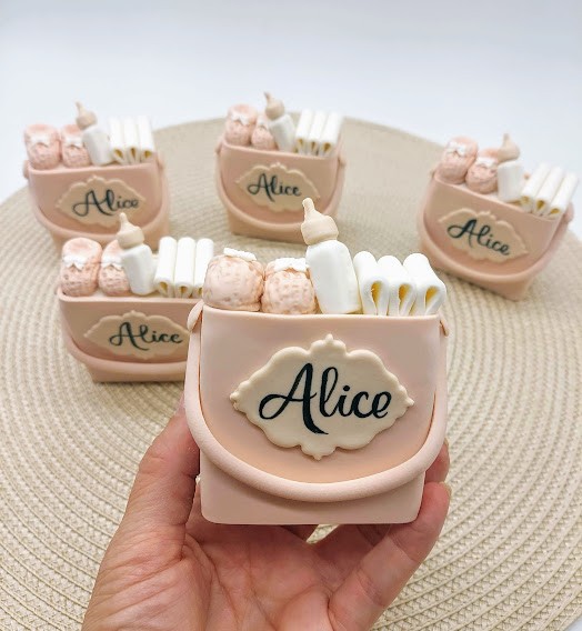 Lindos e saborosos pães de mel decorados em formato de bolsa de maternidade.